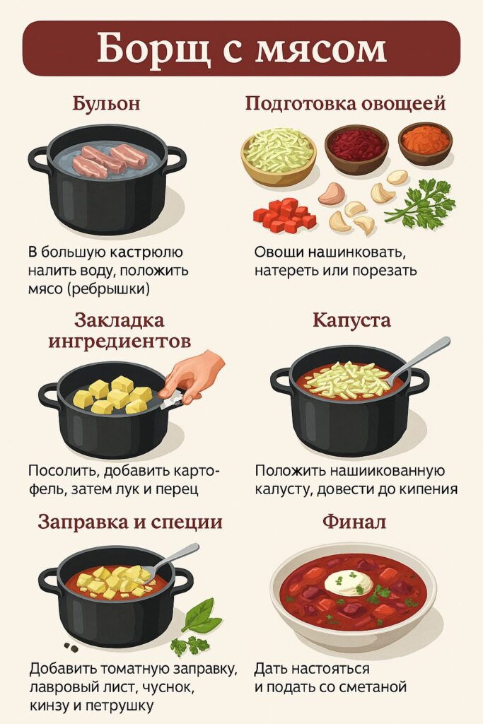 Борщ — это не просто суп, а символ домашнего уюта и традиций. Его насыщенный вкус и аромат объединяют простые ингредиенты в гармоничное блюдо, которое любят во многих странах. Сегодня мы приготовим классический борщ с мясом, свёклой и капустой — густой, ароматный и ярко-красный. Подайте его со сметаной и свежим хлебом, и ваш стол станет по-настоящему праздничным!