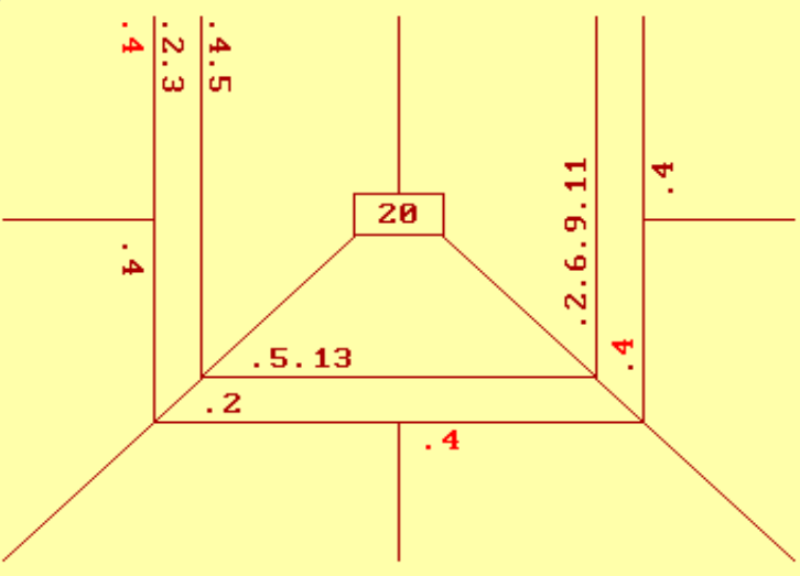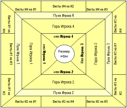 Каждый треугольник (от центра к краям) “принадлежит” одному участнику В вершине обычно пишут инициалы. Следующая секция – так называемая “гора”, затем строчка для записи игр (пули), а две или три секции у основания (на краю листа) – для записи вистов.